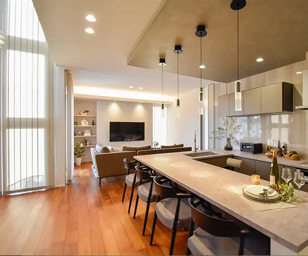 宇都宮市にあるまちかどモデルハウス駒生町展示場は、コの字型のキッチンが主役となる、上質なホテルのような高性能モデルハウスです。
