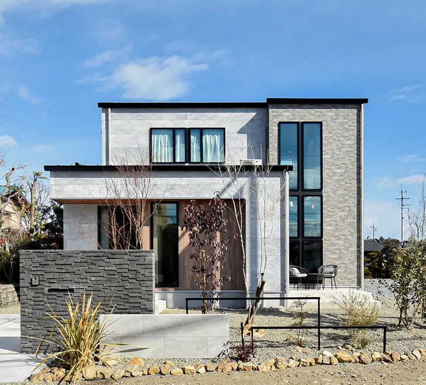 木目や石目を組み合わせたスタイリッシュな外観と、落ち着いた照明や素材感が心地よい室内空間。