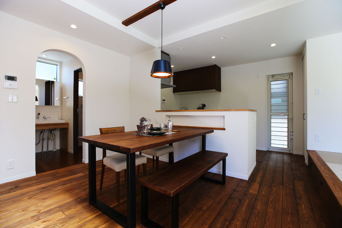 埼玉県さいたま市桜区 N様のお住まいは閑静な住宅街、約44坪の土地に建つ延床31坪の建物です。白い壁に深い茶色の床や梁がインテリアのアクセントになって、カフェのようなおしゃれな雰囲気に仕上がっています。サニタリーに続く入り口のアールの下がり壁もおしゃれな雰囲気を演出してくれています。リビングは吹き抜けになっており、掃き出し窓で外にも視線が抜けるため、とても広々とした空間です。キッチンに立つと1階の空間を全て見渡すことができるので、お子様がいても目が届くデザインされた間取りです。