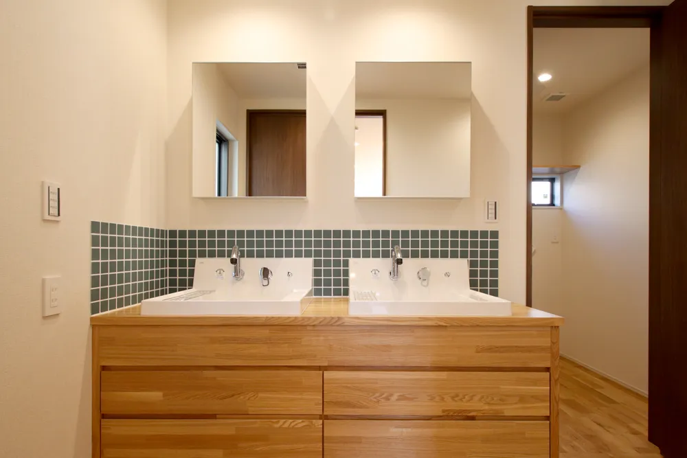 さいたま市のS様邸は、仲の良いご家族が暮らす二世帯住宅です。水回りや玄関、LDKは共有で、1階に親世帯、2階に子世帯の個室を配置。2階にはセカンドリビングを設け、生活スタイルが違う親世帯に配慮しながらもくつろげる空間にしました。家族が多いと荷物が多くなりがちですが、キッチン前面収納、階段下を利用した収納スペース、壁面収納など、空間を活用して収納スペースを確保し、生活空間がスッキリ片付くようにしました。また、鏡と洗面ボウルを2つ並べた洗面台は、2人同時に身支度ができ、忙しい朝も混雑しにくくなります。玄関ホールには、帰宅後すぐに手洗いができるように手洗い場を設け、ウィルスやほこりを部屋に持ち込まないようにしました。家族みんなが「気持ちよく暮らせる工夫」を随所に散りばめたお住まいです。