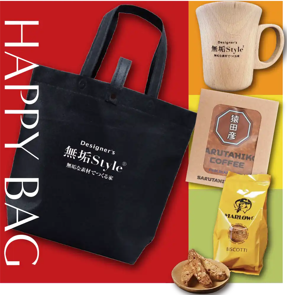 ご予約&ご来場で、無垢スタイルオリジナルマグカップ/猿田彦珈琲ドリップバッグ/マーロウ ビスコッティの3点が入ったお楽しみ袋をプレゼント致します。