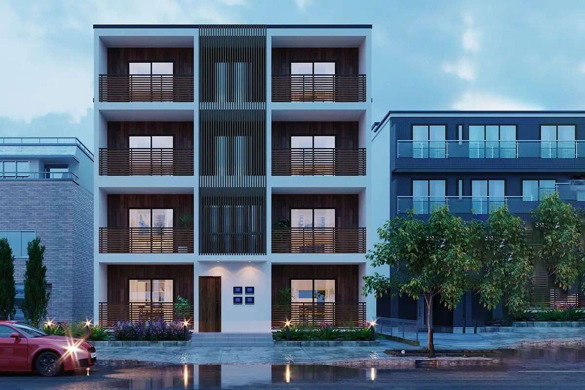 近年、脱炭素社会の流れで木造化が進む中、SE構法は4~5階建て木造ビルに対応。耐火要件を満たしながら、構造設計の強みでコスト削減・納期短縮・施工性向上を実現します。