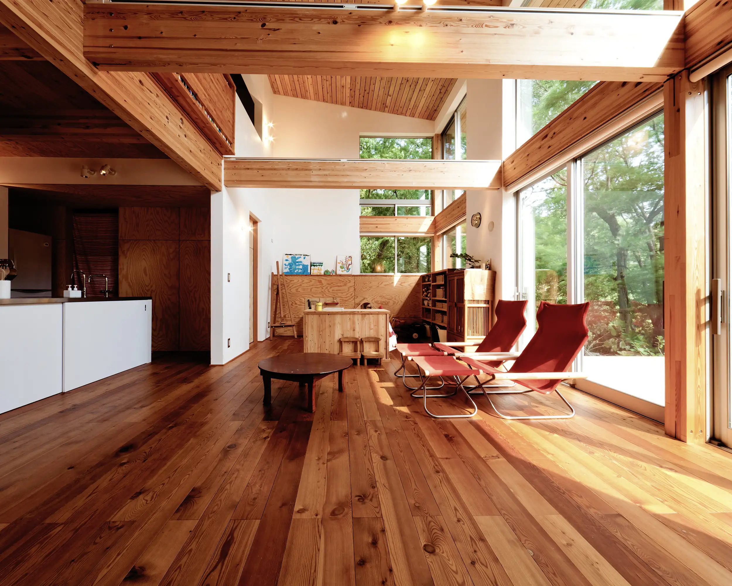 木造住宅でありながら鉄骨並みの強度を誇る“SE構法”。無垢スタイルが得意とする自然素材やデザイン性と組み合わせることで、大開口・大空間を安心して楽しめる、新しい住まいの形を実現します。
