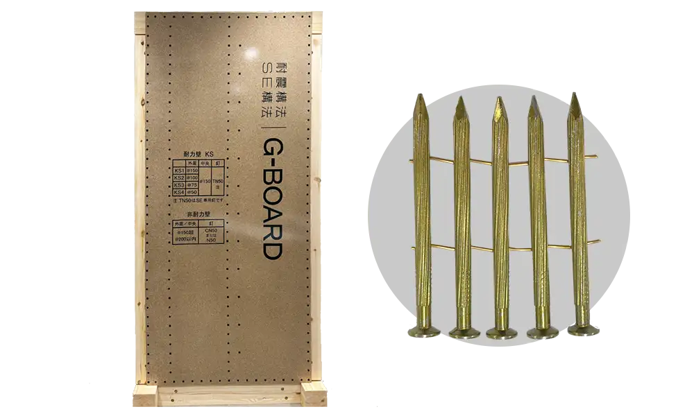 SE構法は、繰り返し発生する地震に備えて実証実験を重ね、せん断強度の高い耐力壁を採用しています。SDGsに貢献する木質廃材由来の「G-BOARD」と、独自開発の釘「TN」により、在来工法以上の強度を実現し、地震に繰り返し耐える性能が確認されています。